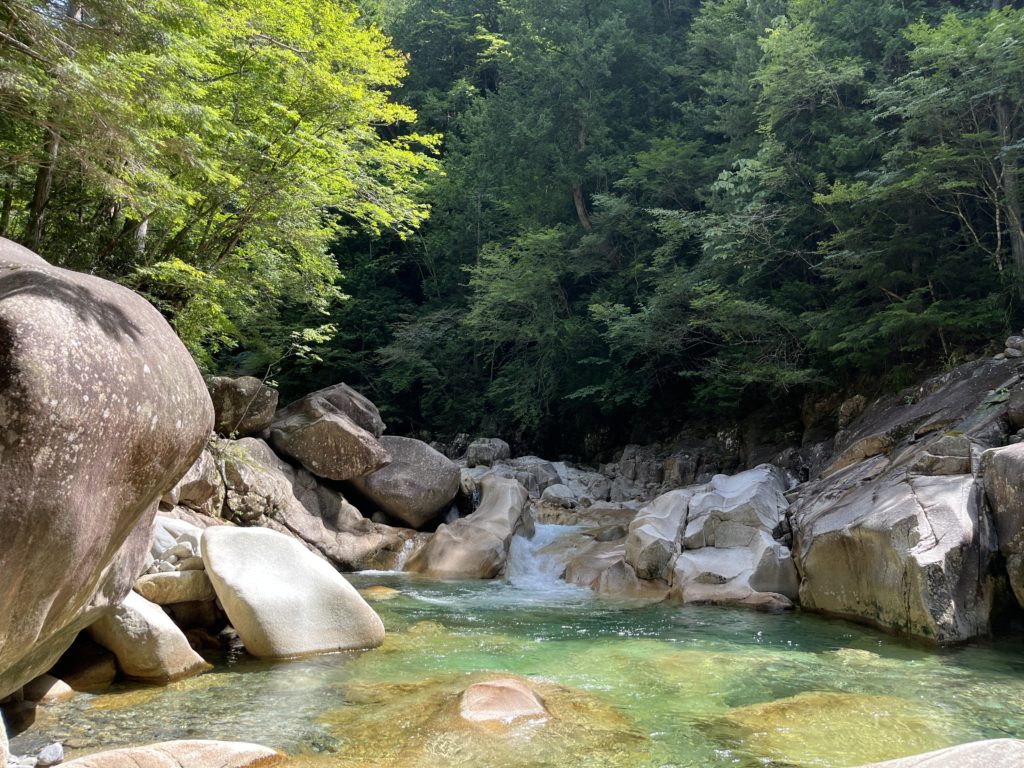 今回はシュウちゃんと念願の柿其渓谷へ行くことにした。シュウちゃんの大好きな泳ぎ沢だ。神奈川県の伊勢原大山ICから高速に乗り、伊那ICでおりて下道を1時間ぐらい車を走らせアプローチした。