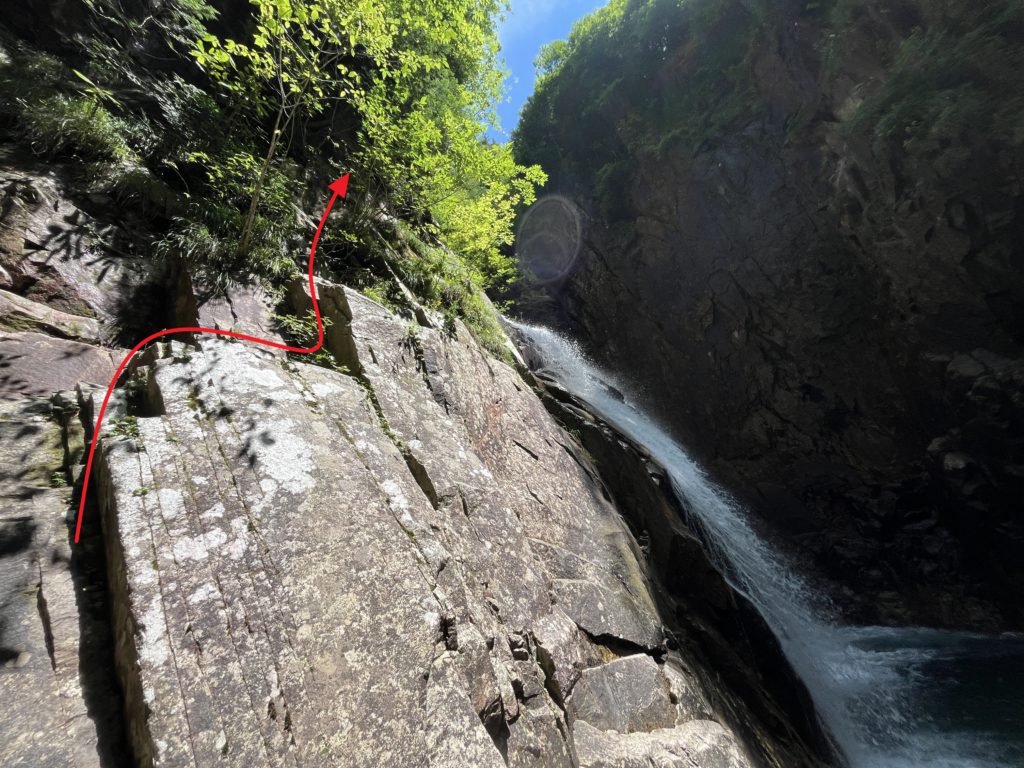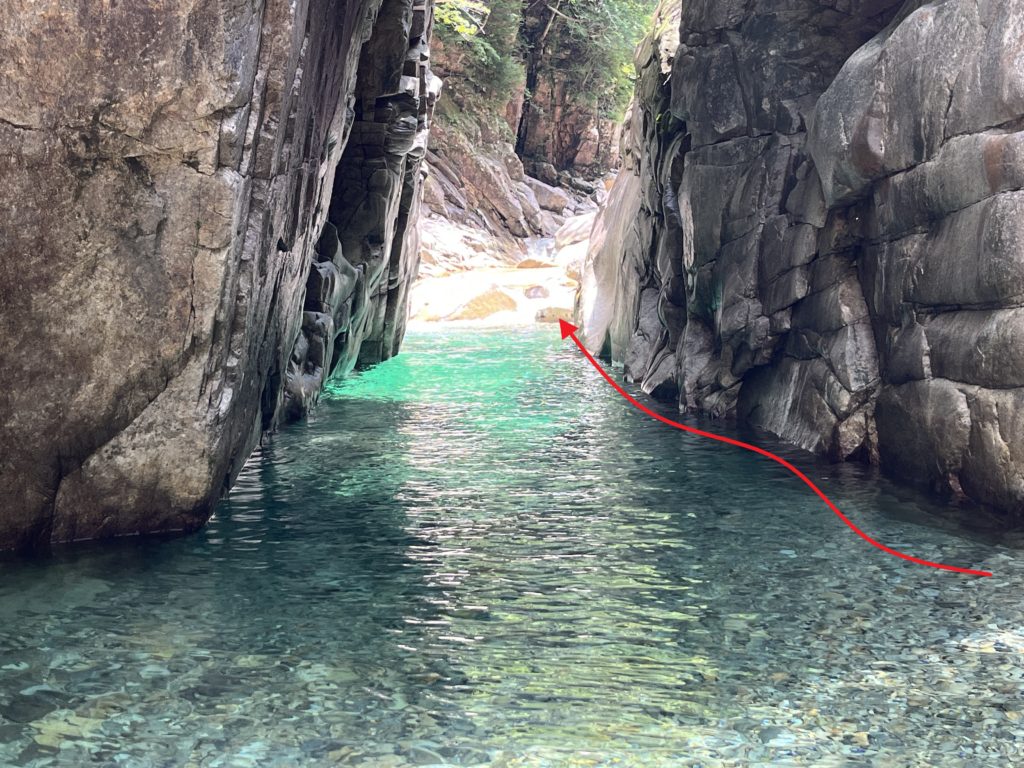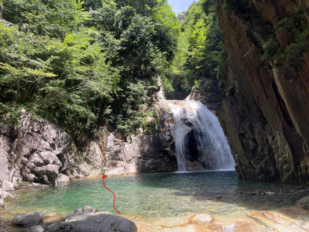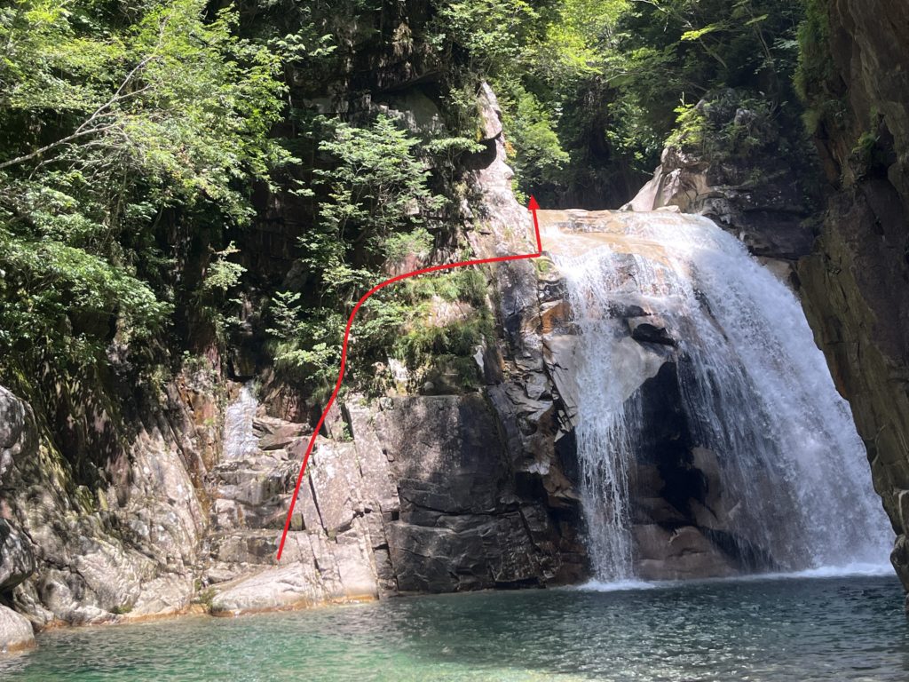 霧ヶ滝です。まず、釜を赤の矢印のように泳いで取付きまで泳ぎます。
